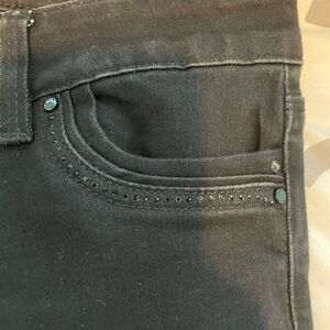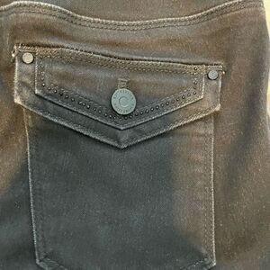 White House Black Market Mid-Rise Skinny Flare Jeans Black Wash Denim with Rhinestone accents. It features a Mid-Rise, Skinny Fit with Flared Legs and Classic 5-Pocket styling.