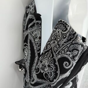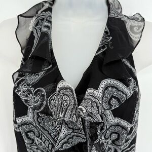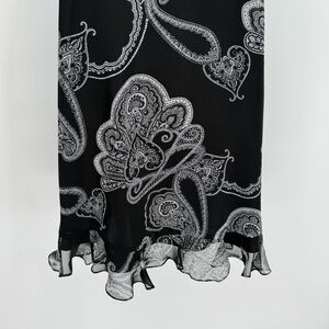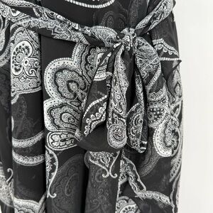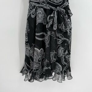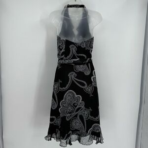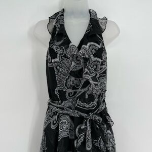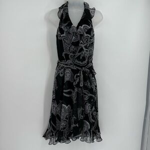 White House Black Market NWT Paisley Print Ruffle Faux Wrap Halter Dress Size 4. Back zip. Ruffled halter. Black white. Elastic in halter strap and back. Belted. Waist 28. Bust 32. Length 38. Measurements are approximate. Chiffon. New.