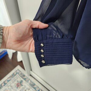 White House Black Market Navy Blue Sheer Button Down Long Sleeve Blouse with silver buttons. Pockets on the front with silver buttons and cuffs on each sleeve include silver buttons and lace detailing. Pleat detailing on the front of the blouse and pleat detailing on the back (this especially gives it some movement in the front and back of the blouse)