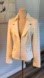 Chic off white tailored jacket in a thicker ponte stretch type fabric. Features a stylish collar, elegant monochromatic piping, silver hardware, partial zip closure, two front pockets, quilted back detail, and feminine pleated back hem. Very good used condition with a few stains/discolored areas as shown, particularly around collar and one in back.