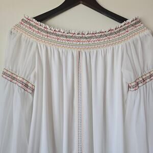 Keywords: WHBM blouse, boho top, smocked top, cottagecore, festival, resort, airy chiffon, embroidered trim, off shoulder long sleeve