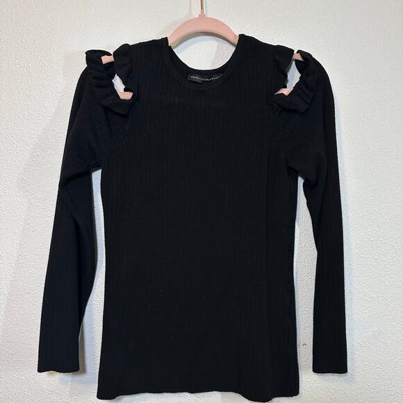 WHBM White House Black Market black long sleeve with ruffled open shoulder cutouts. Super soft and stretchy! Like new. A friend gave me this sweater after she wore it once, but it's unfortunately too large for me. 82% rayon, 16% nylon, 2% spandex