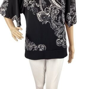 Tags: White House Black Market top, paisley blouse, dolman sleeve shirt, batwing sleeve top, black and white printed blouse, relaxed fit WHBM, scoop neck top, stretch paisley shirt, work to weekend top