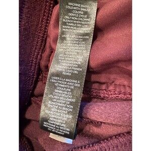 The product is a pair of White House Black Market women's pants in burgundy color, size large. These jogger style pants feature a solid pattern, polyester blend and cotton material, straight leg design, and stretch for comfortable fit. They are suitable for casual occasions and are machine washable for easy care. Perfect for everyday wear, these pants have a regular fit and are from a trusted brand.