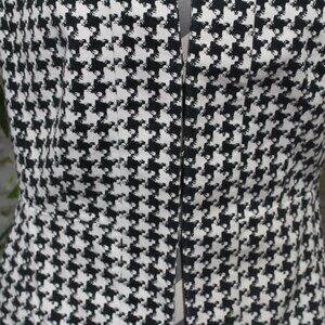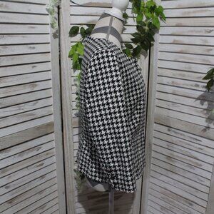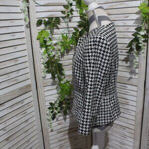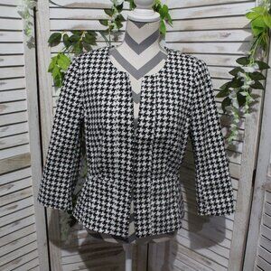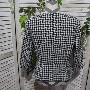 White House Black Market Houndstooth Blazer In black and white with peplum. Size 10. Hook and eye closure. Good condition. Measurements taken flat: pit to pit 18”, length 22”, waist 16”, sleeve 19”. Can be machine washed gentle, hang to dry or dry cleaned. Classic piece. (O25)