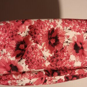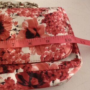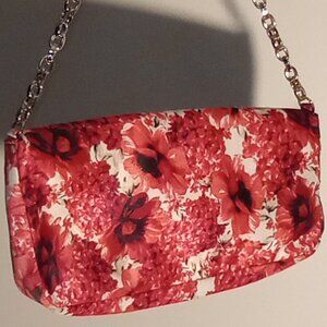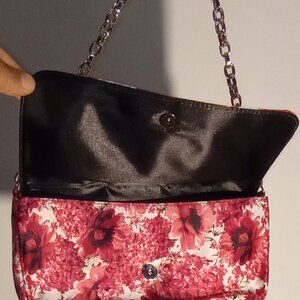 White House Black Market Pink Floral Clutch - White, pink & black floral clutch with a silver chain strap and snap front flap closure.