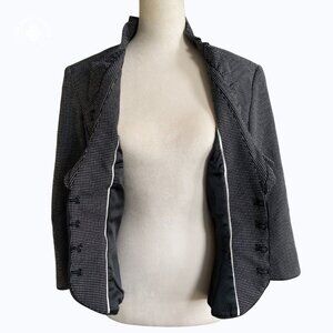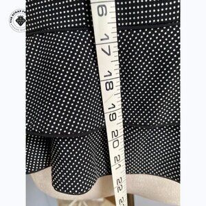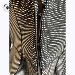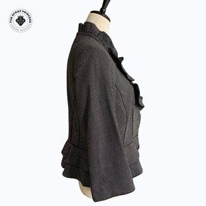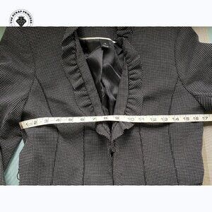 Add a touch of polished flair to your professional or casual wardrobe with this chic White House Black Market blazer. The classic black and white micro-dot pattern is complemented by a delicate ruffled collar and a flattering peplum hem that creates a beautiful silhouette. This blazer is perfect for pairing with trousers for the office or with jeans for a sophisticated, elevated look.