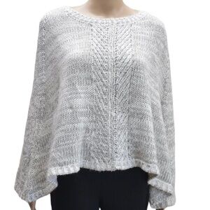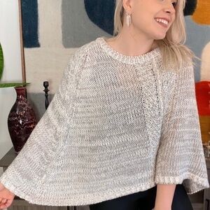 This is a WHBM White House Black Market pullover wool blend poncho Knit sweater. White gray silver metallic threading. Rounded neckline. Machine washable. Women’s size M or medium. Length 24”. Very nice preowned condition.