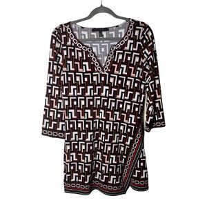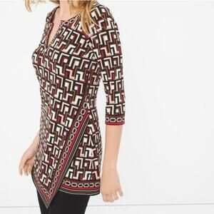 Everything about this tunic is a head turner. If boasts an energetic geometric pattern and an asymmetric overlay that complements its form-flattering silhouette. Plus, we love how it makes even simple black pants infinitely chic.