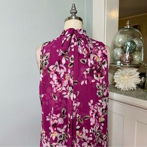 WHBM White House Black Market Purple Floral Tie Neck V Neck Chiffon Shift Dress Sleeveless Dressy Church Wedding Guest Date Night Out Cocktail Party Formal Event Special Occasion