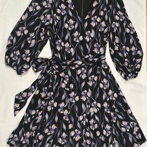 Stunning and sophisticated White House Black Market (WHBM) dress in a gorgeous "Royal Iris" floral print. The vibrant purple and lavender blooms pop beautifully against the classic black background.