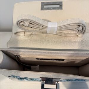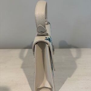White, House, Black, Market, small purse, 8 inches tall 10 inches wide, handle and removable shoulder strap. Cream with beautiful blue embroidered flowers, outer slip pocket, inside one zip pocket, and one slip pocket