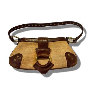 Add a touch of elegance to your wardrobe with this beautiful White House Black Market purse. The combination of rich brown leather, textured raffia fabric, and antique gold accents makes this handbag both sophisticated and stylish. The fabric gives off a tropical vibe, perfect for a vacation getaway or a casual day out. The antique gold studs on the straps add a unique flair, while the large gold ring hardware completes the chic, timeless look.