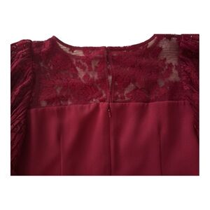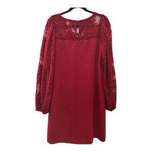 This stunning red sheath dress from White House Black Market is designed for cocktail occasions, featuring elegant bishop sleeves and a classic crew neck. The long sleeves are crafted with intricate lace, adding a touch of sophistication.
