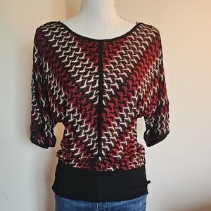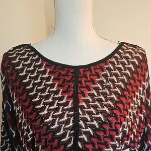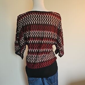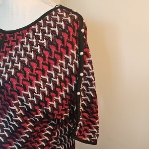 Chic knit dolman top with red and black chenron pattern. Ideal for stylish outings. Gold buttons on sleeve. (g4)