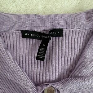 Keywords: White House Black Market, purple knit top, ribbed sweater, collared top, button front cardigan, long sleeve top, bell sleeve sweater, women's fashion, casual wear, workwear, elegant top, lavender sweater, ladies knitwear, size L top, preppy style