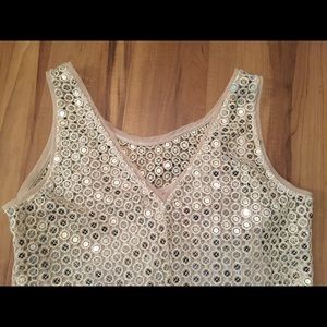 White House Black Market Gold Sequin Tank, size small, very good condition. Built in nude color tank underneath. The string attaching the nude tank to the sequin tank is separated in one side but can easily be reattached. Super cute for parties and can be dressed up or down!