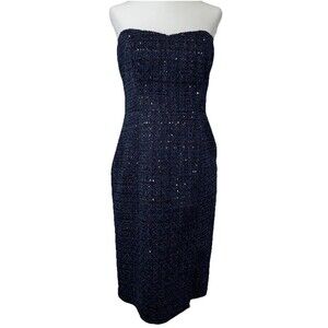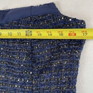 This White House Black Market Sequin Tweed Dress is perfect for a holiday party or special occasion. The sleeveless midi dress features a classic fit in a festive blue color, accented with sequins for added sparkle. The polyester lining and machine washable fabric make it easy to care for, while the zip closure adds a touch of elegance. Perfect for the winter and fall seasons, this dress is a stylish and timeless choice for any fashion-forward woman.