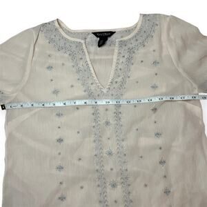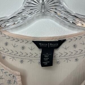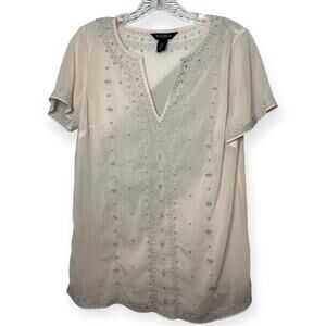 White House Black Market Sheer Embellished Blouse Beige Silver Beaded Boho Sz 4