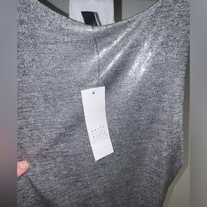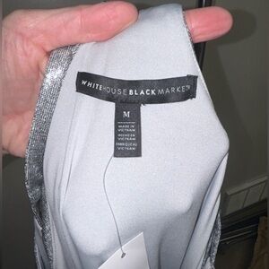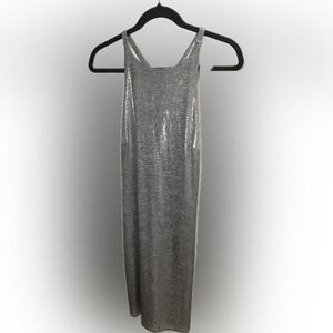 Elegant silver sheath dress. Sleeveless design. Perfect for evening wear.