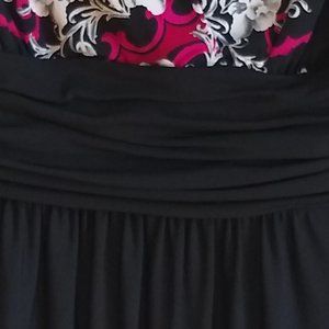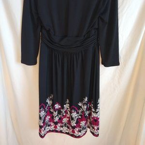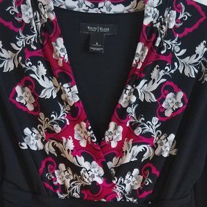This gently used White House Black Market dress, has a V neck with rushing at the waist. Beautiful design of purple with white flowers on the collar and the bottom of the dress. It is a pull over style with ¾ inch sleeves. Perfect office dress or brunch. Thank you for stopping by my closet.