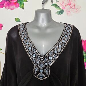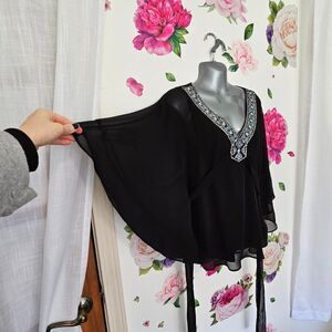 Dramatic dressy top with silvertone embroidery on V-neck line, chiffon capelet style with waist tie.