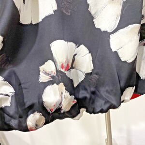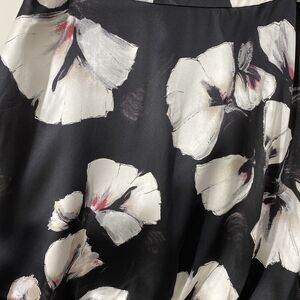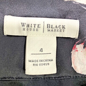 White House Black Market Skirt - Size 4 - satin finish silk fabric in a mod floral print black with soft white flowers - a bubble hem knee length design. Fully lined - size zip - polished elegant look. Gently worn - no flaws - so cute!