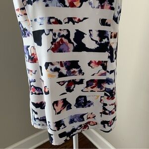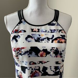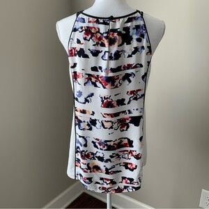 Abstract florals awaken this halter design with cut-in arm openings and princess seams for an amazing fit. This top is suspended by a trio of straps and punctuated by black piping at the seams. Keep your look simple by wearing this energized top with muted or dark-colored pants.