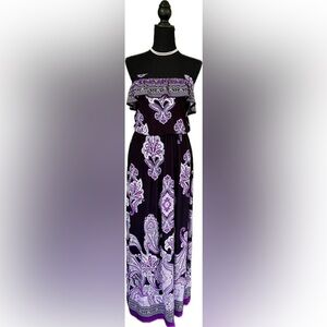 Chic strapless dress with bold purple designs. Ideal for special occasions.