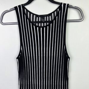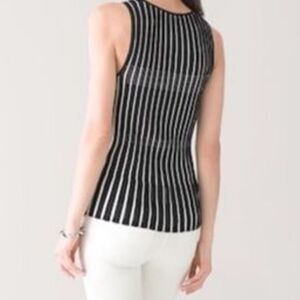White House Black Market WHBM Striped Peplum Sweater Tank in black and white. This sleeveless woven rib knit top features a beautiful vertical black and white pinstripe pattern with a round neck and flattering flared bottom. Perfect paired with jeans for a casual look or a blazer and slacks for business wear. Excellent, like new condition. Women's size S small, measurements pictured.