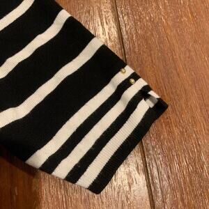This White House Black Market striped short sleeve pullover sweater is a stylish addition to any wardrobe! It is in great pre-owned condition and features small, elegant gold accent buttons on the sleeves.