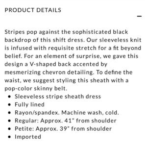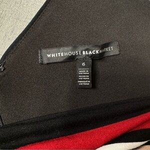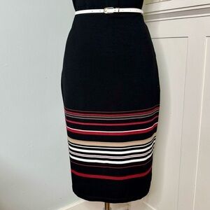 White House Black Market Striped Sheath Dress with Faux Leather Trim. Slimming design. Faux leather trim at shoulders. Lined with a full zipper in back. White adjustable belt. Like new. Size 6. Add a blazer to wear it all year. Perfect for work, a party or date night!
