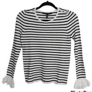 White House Black Market Sweater Black Striped Ruffle Cuff Gold Button