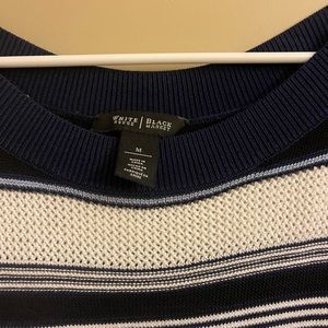 This is a WHBM sweater in size medium. Pit to Pit measures 19 1/2 inches. Length 22 1/2 inches. Colors are navy, white and light blue striped. Very good condition.
