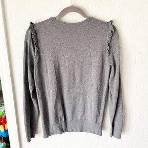 DETAILS: White House Black Market sweater size medium, LOVED spell out in gray and metallic gold. Puff shoulder with ruffle, banded waist hem. Viscose nylon polyester cashmere wool blend, machine wash.