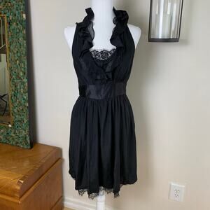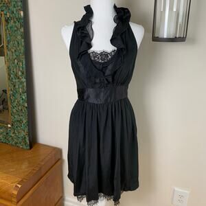 White House Black Market Size 4 Halter Neck Ruffle Silk Dress Black Lace Trim Cocktail