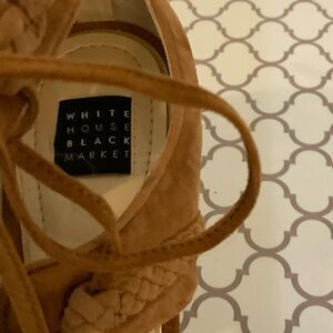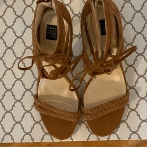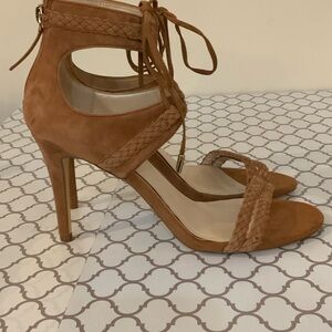 Preloved-Chic suede tan heels with leather braided straps. Stylish lace-up design, functional zippers in the back. Perfect for any event. Note peeling in the pictures.