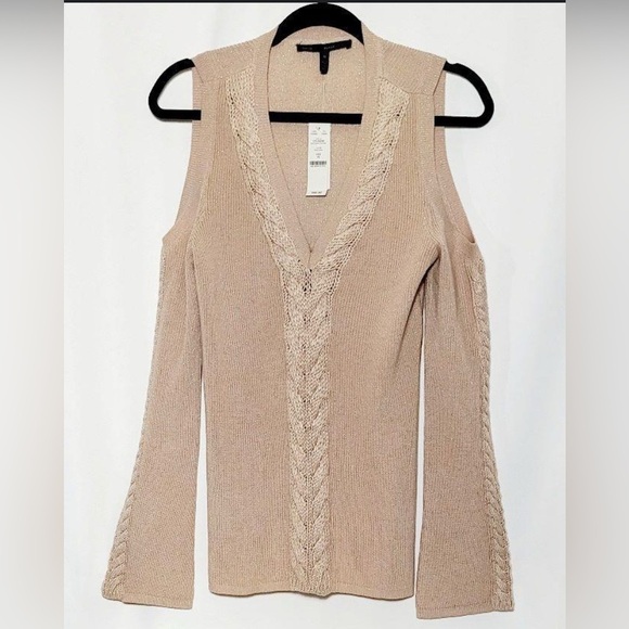 White House Black Market Tan V-Neck Sweater cashmere with Cable Knit NWT