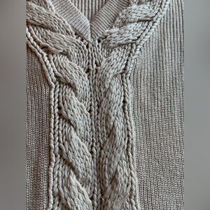 This sophisticated tan V-neck sweater from White House Black Market features elegant cable knit detailing and a classic silhouette. Its medium-weight knit texture makes it a versatile layering piece, perfect for any occasion.
