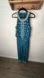 Gorgeous teal jumpsuit with a high neck and cutout in the front. Stunning pattern. Wide leg pants with a 33” inseam. Fully lined. Zipper in the back and two small buttons to close the neck area.