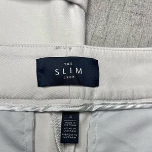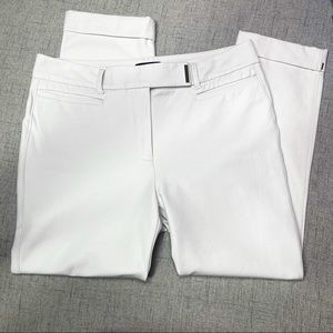 White House Black Market The Slim Crop. These cotton stretch pants deliver a long, lean look and have a footwear-flaunting cropped fit. Two real pockets in front, back pockets are factory sewn shut. Has belt loops. Zip fly with hook and bar closure. Very light cream color, and a bonus-everything matches. Like new. Size 4.