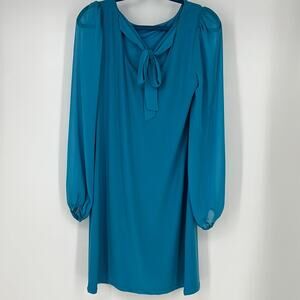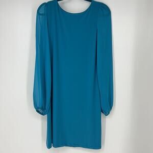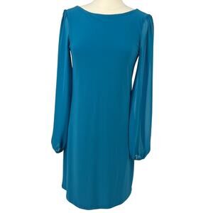 Elevate your wardrobe with this stunning White House Black Market turquoise blue dress. With its elegant design and long, sheer sleeves, this dress is perfect for any special occasion or a stylish day out.