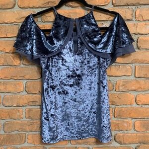 White House Black Market Velvet Cold Shoulder Top Ruffle Blue Summer Womens XS