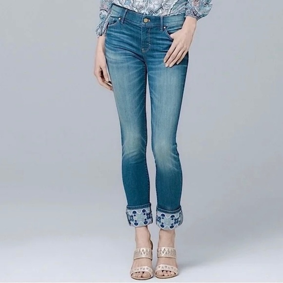 White House Black Market (WHBM) Embroidered Hem The Skinny Crop Jeans Boho