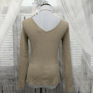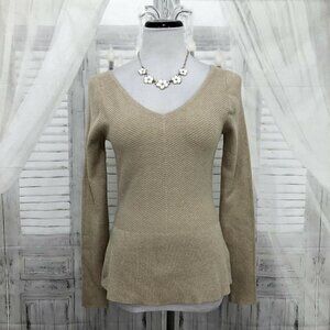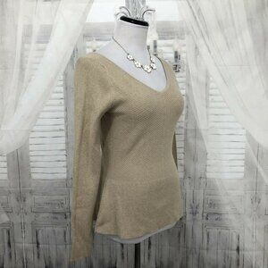 White House Black Market WHBM Small Beige Gold V Neck Peplum Sweater Knit Wool