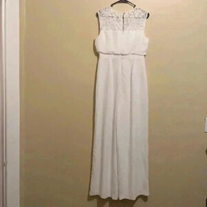 Lace detailed blouson jumpsuit, sleeveless, banded waist, vented cape back, zip fly with hook and eye closure and partially lined.