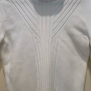This chic white sweater from White House Black Market showcases a stylish turtleneck and a flattering form-fitting silhouette. The intricate ribbed pattern adds a touch of elegance and texture, making it a versatile piece for any wardrobe.