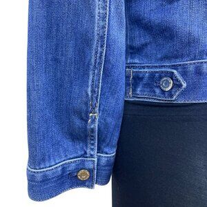 Denim & Co. Women's Blue Denim Button-Front Fitted Jacket is a versatile piece ideal for casual or semi-casual wear. Designed with decorative stitching and functional pockets, it exudes a classic yet stylish look. Perfect for layering over tops in all seasons without showing any flaws or defects.
