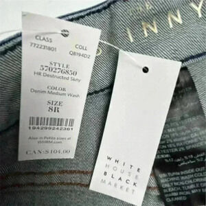 Keywords: White House Black Market, women's jeans, size 8, skinny jeans, high-rise, medium wash, denim, casual wear, new with tags, blue jeans, slim fit, 5-pocket design, zip fly, button closure, versatile.