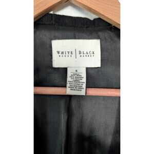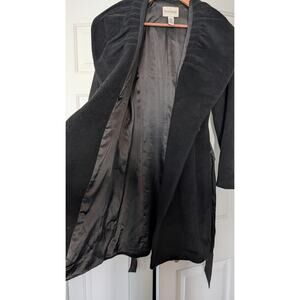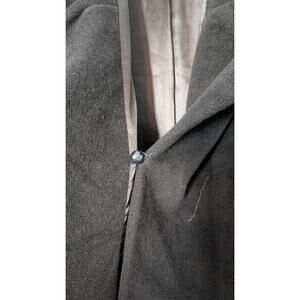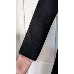 Absolutely gorgeous black wool coat! Size small. Please note, the front button closure is missing, but there is still an inside button closure and a satin tie belt to keep the jacket closed. There is also a marking on the back collar-I haven't washed or tired to remove. Even with flaws this jacket is beautiful and totally wearable! Lined. Approximate measurements:
